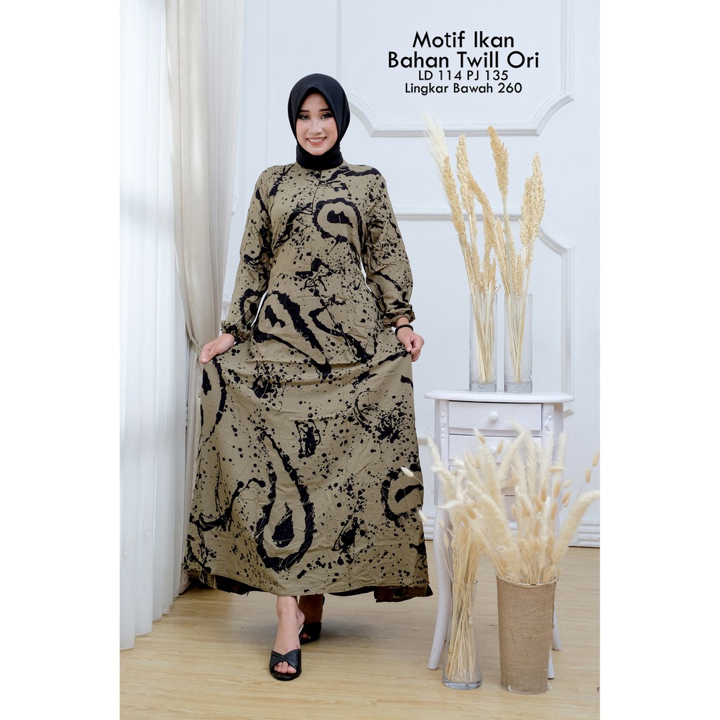 Gamis Abstrak twill bisa di pakai untuk sehari-hari memakai resleting depan bisa untuk ibu menyusui